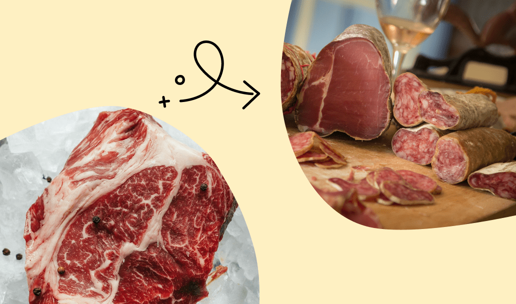 Start QuizSalami is a meat product typically made from pork or beef, appropriately salted, smoked, "stuffed" with fat and spices, and kept in a room with special conditions (air temperature should be +15 C, and humidity - 60-70%). By the way, salting in salami has a double "mission." Salt helps the meat to ripen and kills harmful microorganisms. As the meat matures and dries, the consistency of this sausage becomes denser.