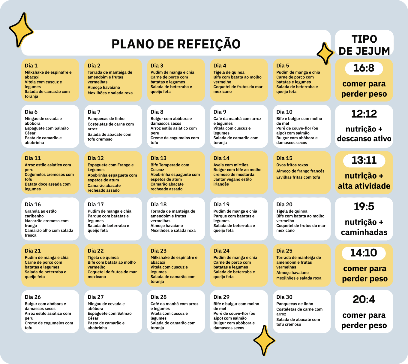 É importante considerar também um horário de jejum intermitente que se alinhe com a sua rotina diária, garantindo que consome refeições equilibradas durante a sua janela de alimentação.